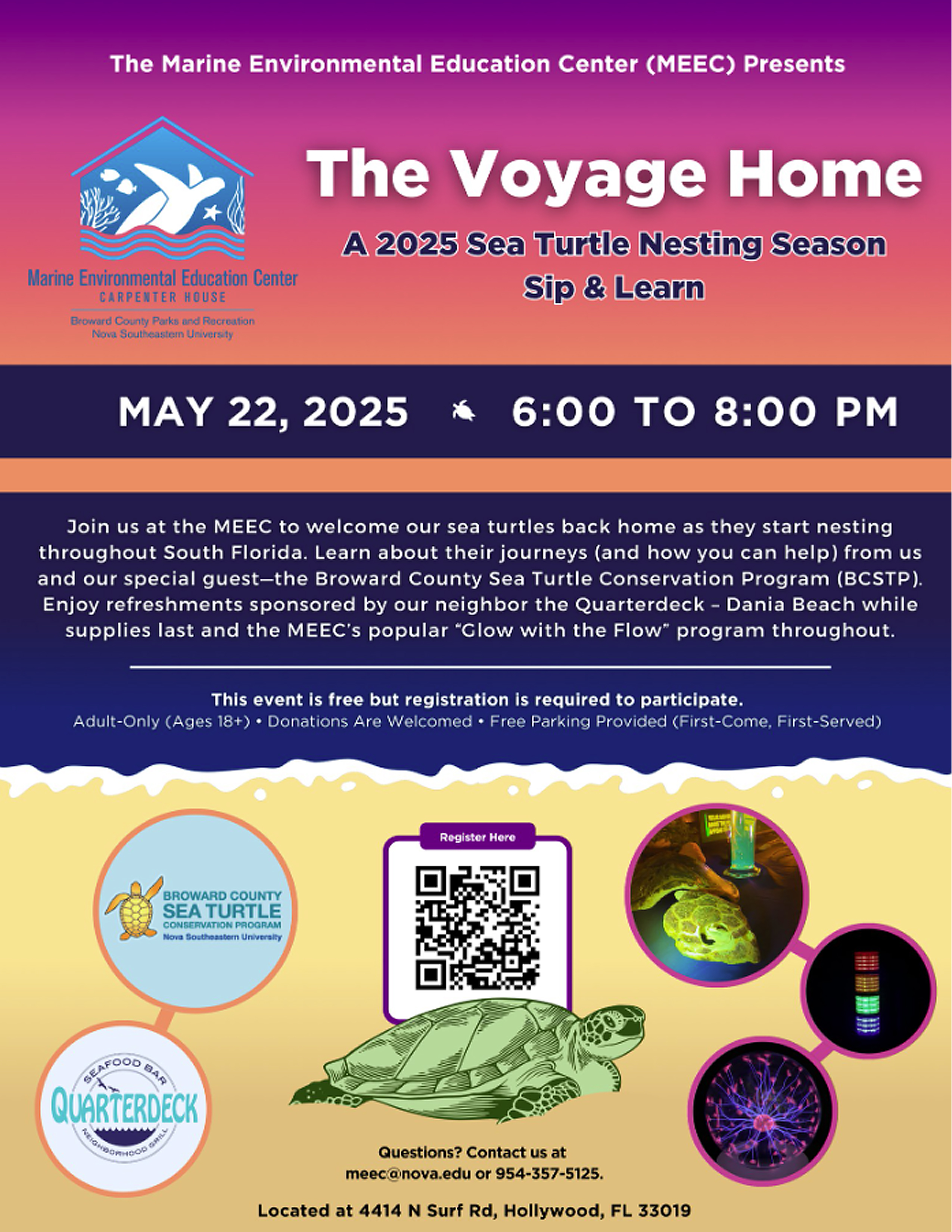 Join us at the MEEC to welcome our sea turtles back home as they start nesting throughout South Florida. Learn about their journeys (and how you can help) from us and our special guest—the Broward County Sea Turtle Conservation Program (BCSTP).